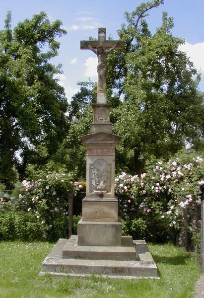 Památka místního významu. Kamenný kříž s korpusem ukřižovaného Krista osazen na dvoudílném hranolovém podstavci. Ten je v dolní části členěn nikami s reliéfy Nejsvětější Trojice, sv. Josefa a sv. Františka Xaverského. Nad římsou se štítkem v čele zúžená část podstavce pojednaná reliéfními symboly eucharistie. Podstavec uzavírá drobná římsa. Na soklu německý nápis s vročením 1888.